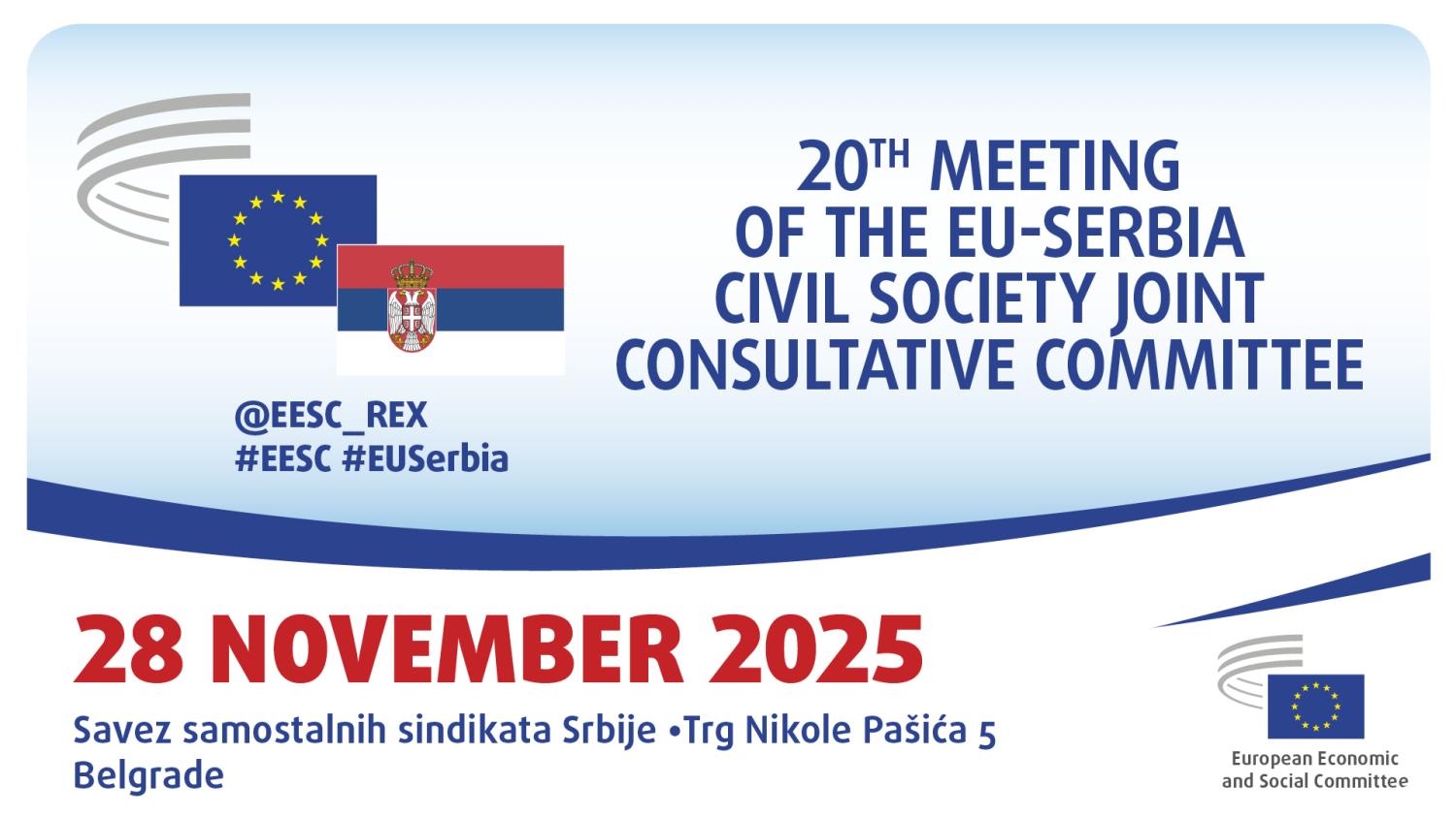 The EU–Serbia Joint Consultative Committee (JCC) held its twentieth meeting on 28 November 2025 in Belgrade, Serbia, with the participation of representatives of state institutions, civil society organisations, trade unions, and the European Economic and Social Committee (EESC).