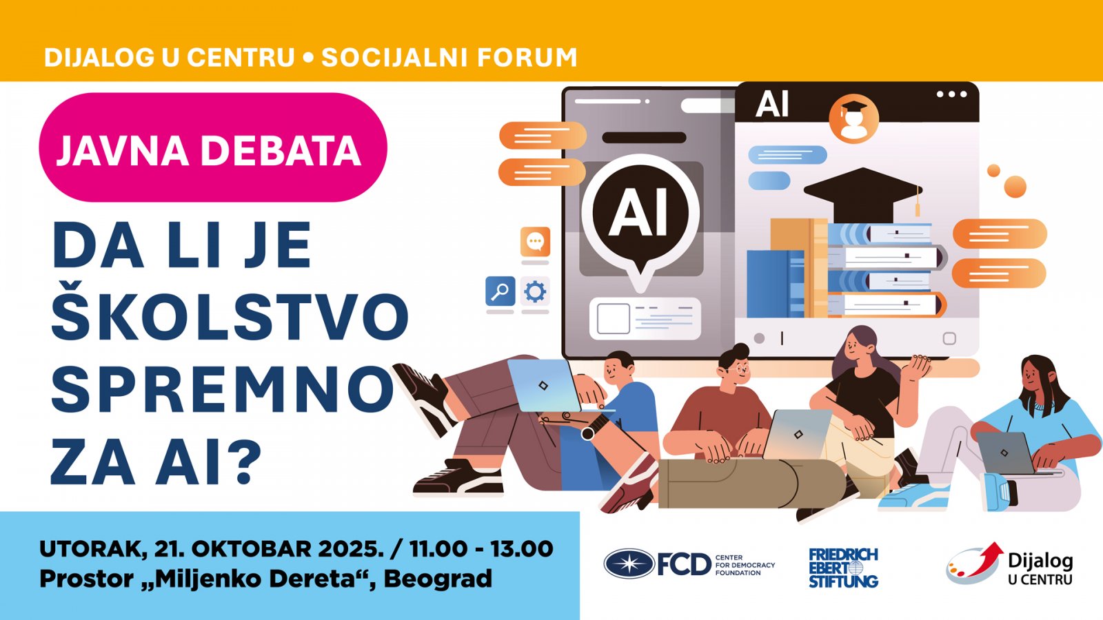 Fondacija Centar za demokratiju organizovala je 21. oktobra 2025. godine, u saradnji sa Fondacijom Friedrich Ebert, debatu na temu „Da li je školstvo spremno za AI?“.