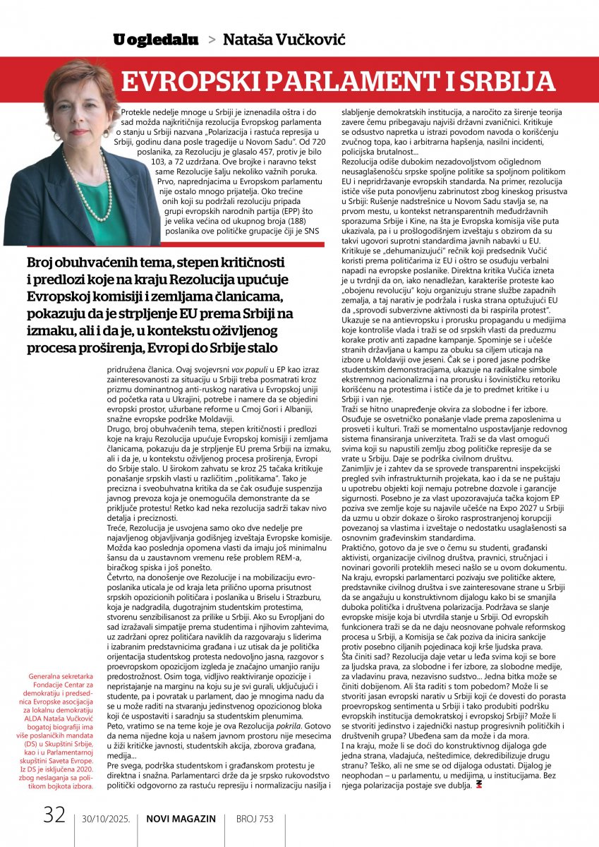 Protekle nedelje mnoge u Srbiji je iznenadila oštra i do sad možda najkritičnija rezolucija Evropskog parlamenta o stanju u Srbiji nazvana „Polarizacija i rastuća represija u Srbiji, godinu dana posle tragedije u Novom Sadu“. Od 720 poslanika, za Rezoluciju je glasalo 457, protiv je bilo 103, a 72 uzdržana. Ove brojke i naravno tekst same Rezolucije šalju nekoliko važnih poruka.