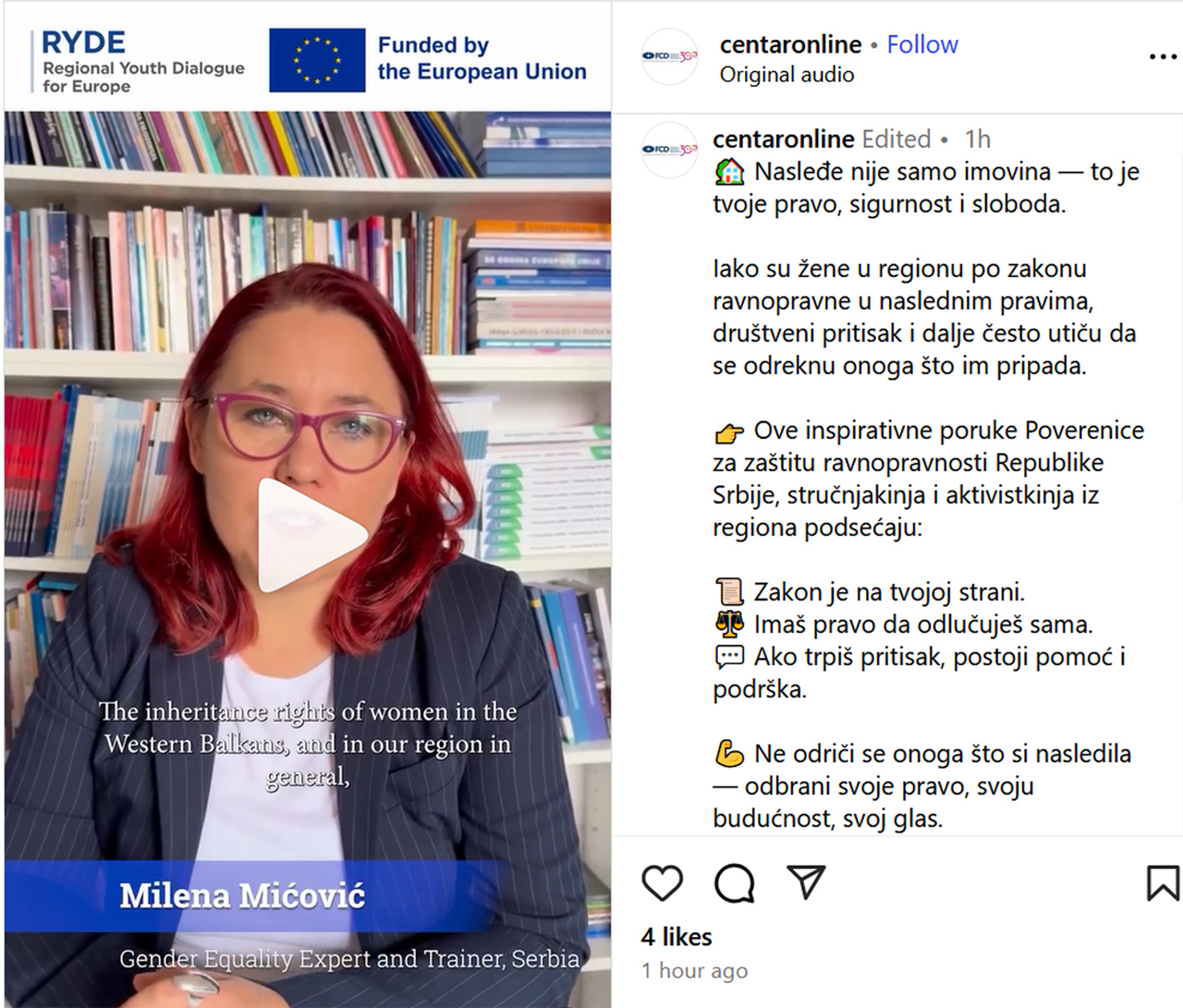 As part of a mini online campaign carried out within this project, a video has been released to raise awareness – especially among young women in the Western Balkans – about their inheritance rights and to promote positive narratives around women’s ownership.
