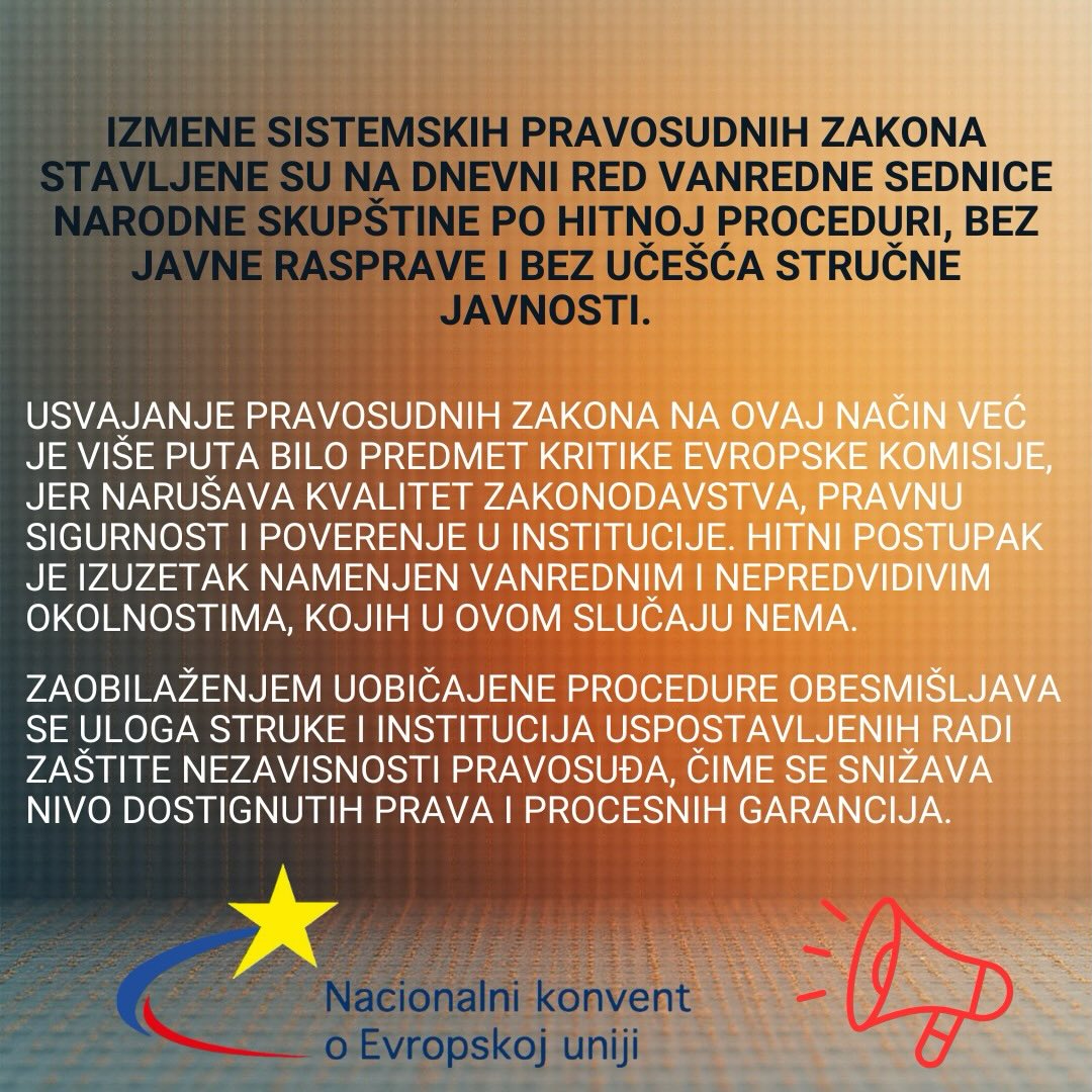 The Working Group of the National Convention on the European Union for Chapter 23 calls on the National Assembly to refrain from considering amendments to judicial laws under an urgent procedure and to return reform processes to a framework of transparent, inclusive, and lawful procedures, in accordance with constitutional principles and the European obligations of the Republic of Serbia.