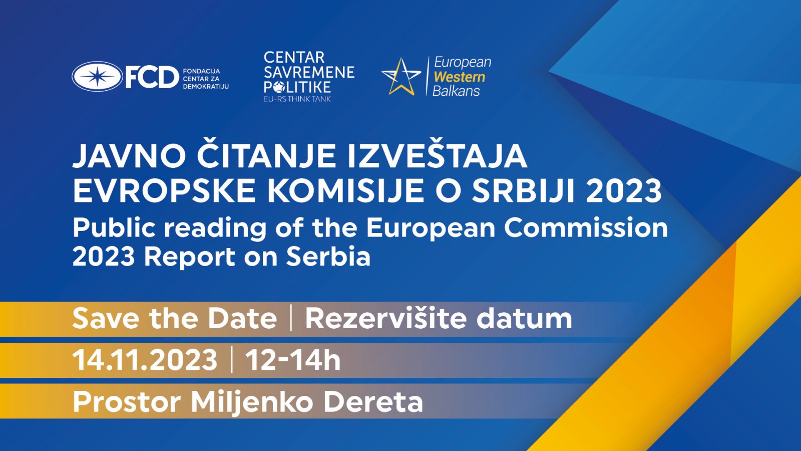 Centar savremene politike i Fondacija Centar za demokratiju organizuju tradicionalno „Javno čitanje izveštaja Evropske komisije o Srbiji 2023“, koje će biti održano u utorak, 14. novembra 2023. godine od 12:00 do 14:00 časova u Prostoru Miljenko Dereta (ul. Dobračina 55, Beograd), kao i preko Zoom platforme.
