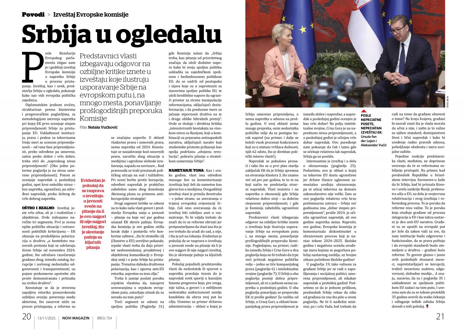 Pojedine reakcije predstavnika vlasti, međutim, ne doprinose uverenju da će se reformama ozbiljnije pristupiti. Na primer, kad predsednik Republike u briselskom intervjuu Euronews-u kaže da bi Srbija, kad bi priznala Kosovo i uvela sankcije Rusiji, prekosutra ušla u EU, na delu je svojevrsna relativizacija i ovog izveštaja i reformskog procesa. To je poruka da reforme nisu važne. To je poruka koja otuđuje građane od procesa integracije u EU i kao takva sastavni je deo anti-EU narativa. Građani su se uputili na evropski put jer žele da zakon važi za sve, da nam institucije budu odgovorne i funkcionalne, da se prava poštuju i da evropski standardi budu utemeljeni u društvu – građani hoće reforme. To govore glasno i jasno ovih poslednjih dvanaest meseci, suprotstavljajući se korupciji, tražeći nezavisno sudstvo, odgovornost, slobodne medije... A znaju, naravno, da su i poglavlje 35 i usklađenost sa spoljnom politikom EU zadaci na tom putu. I uverena sam da su se tokom proteklih 35 godina uverili da svako čekanje i odlaganje teških odluka Srbiju dovodi u teži položaj.