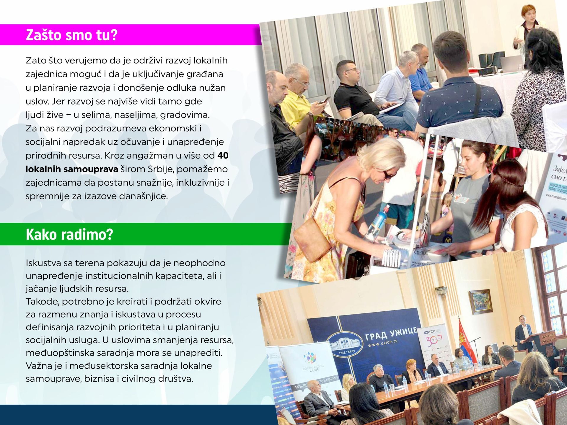 Zato što verujemo da je održivi razvoj lokalnih zajednica moguć i da je uključivanje građana u planiranje razvoja i donošenje odluka nužan uslov. Jer razvoj se najviše vidi tamo gde ljudi žive – u selima, naseljima, gradovima. Za nas razvoj podrazumeva ekonomski i socijalni napredak uz očuvanje i unapređenje prirodnih resursa. Kroz angažman u više od 40 lokalnih samouprava širom Srbije, pomažemo zajednicama da postanu snažnije, inkluzivnije i spremnije za izazove današnjice.