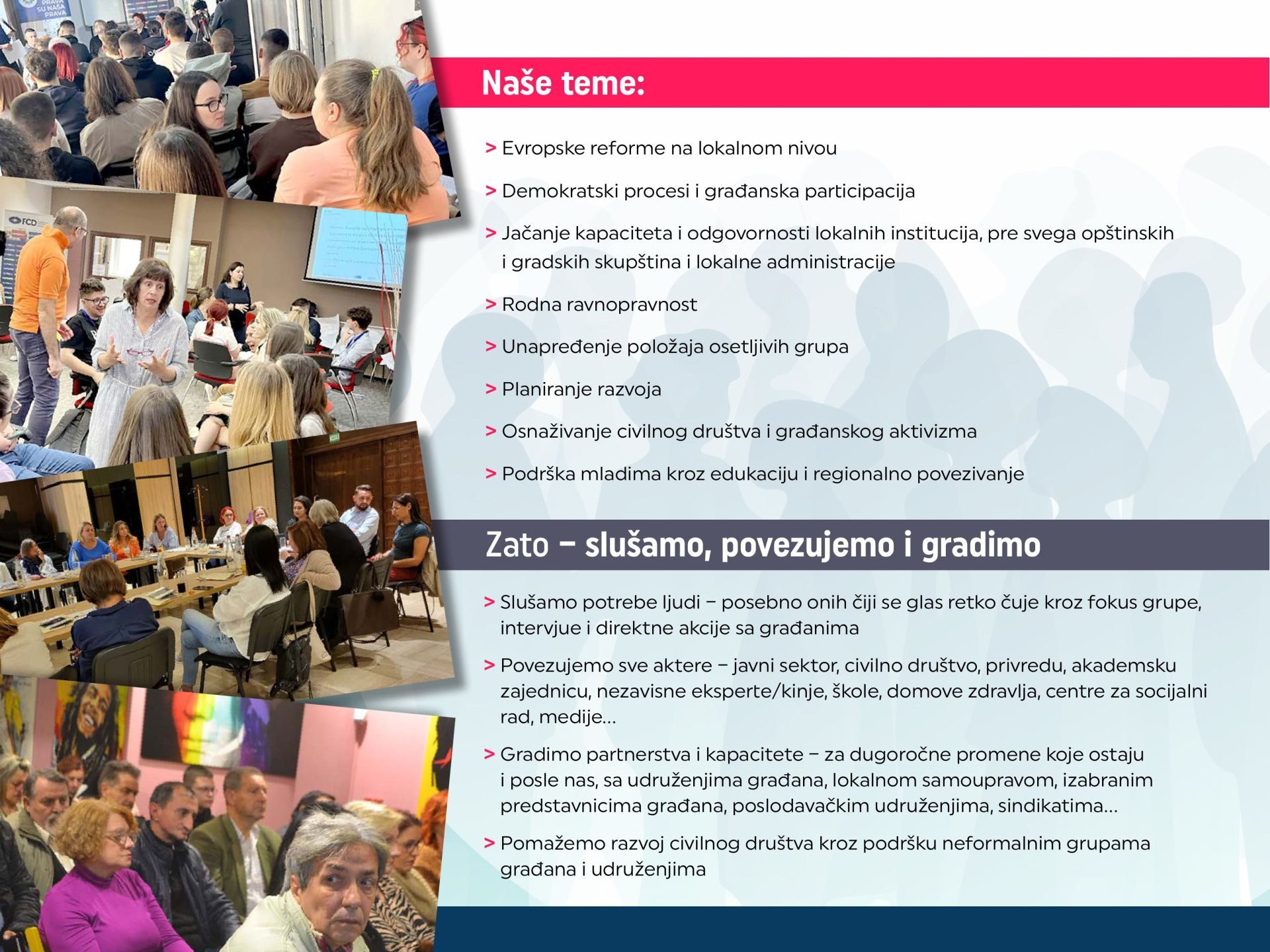 - Gradimo partnerstva i kapacitete – za dugoročne promene koje ostaju i posle nas, sa udruženjima građana, lokalnom samoupravom, izabranim predstavnicima građana, poslodavačkim udruženjima, sindikatima…