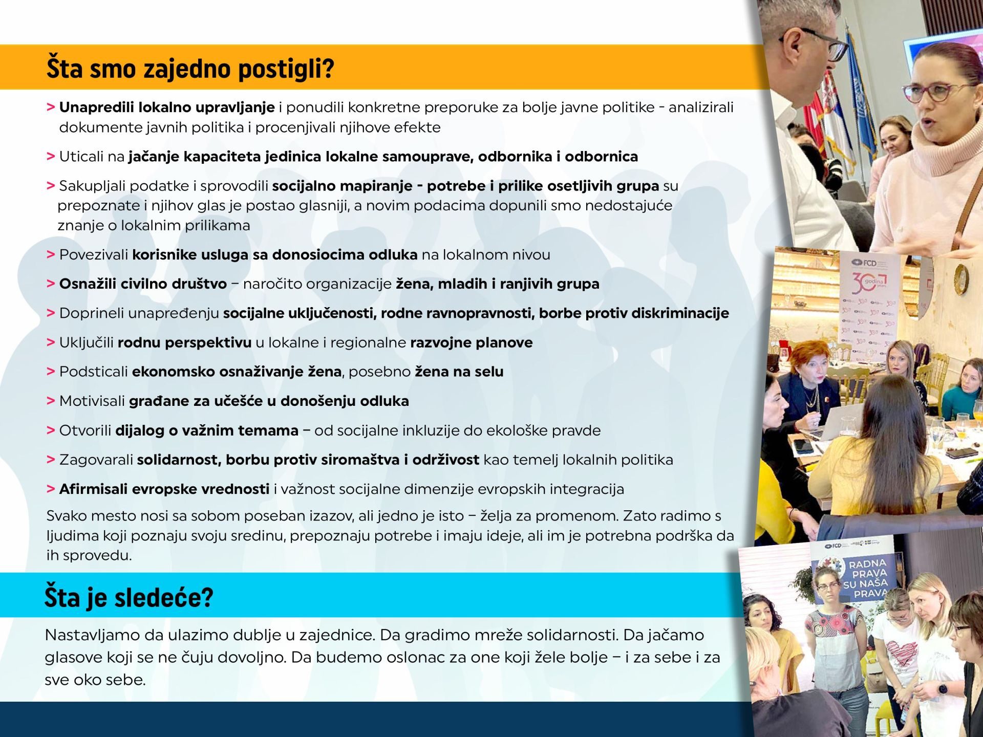 Svako mesto nosi sa sobom poseban izazov, ali jedno je isto – želja za promenom. Zato radimo s ljudima koji poznaju svoju sredinu, prepoznaju potrebe i imaju ideje, ali im je potrebna podrška da ih sprovedu.