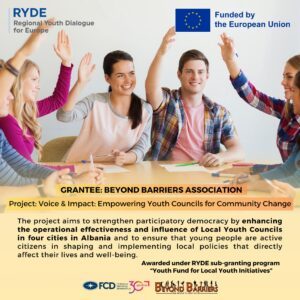 Kroz Omladinski fond „Lokalne inicijative mladih“ (Youth Fund) Regionalnog dijaloga mladih za Evropu (RYDE) podržali smo regionalne projekte koji će doprineti unapređenju aktivizma i participacije mladih, njihovom učešću u procesima izrade javnih politika na lokalnom i nacionalnom nivou, povećanju političke participacije žena, osnaživanju mladih za promene u zajednici, za dijalog, negovanje mira i integracije, zagovaranje zelene budućnosti i Garancija za mlade.