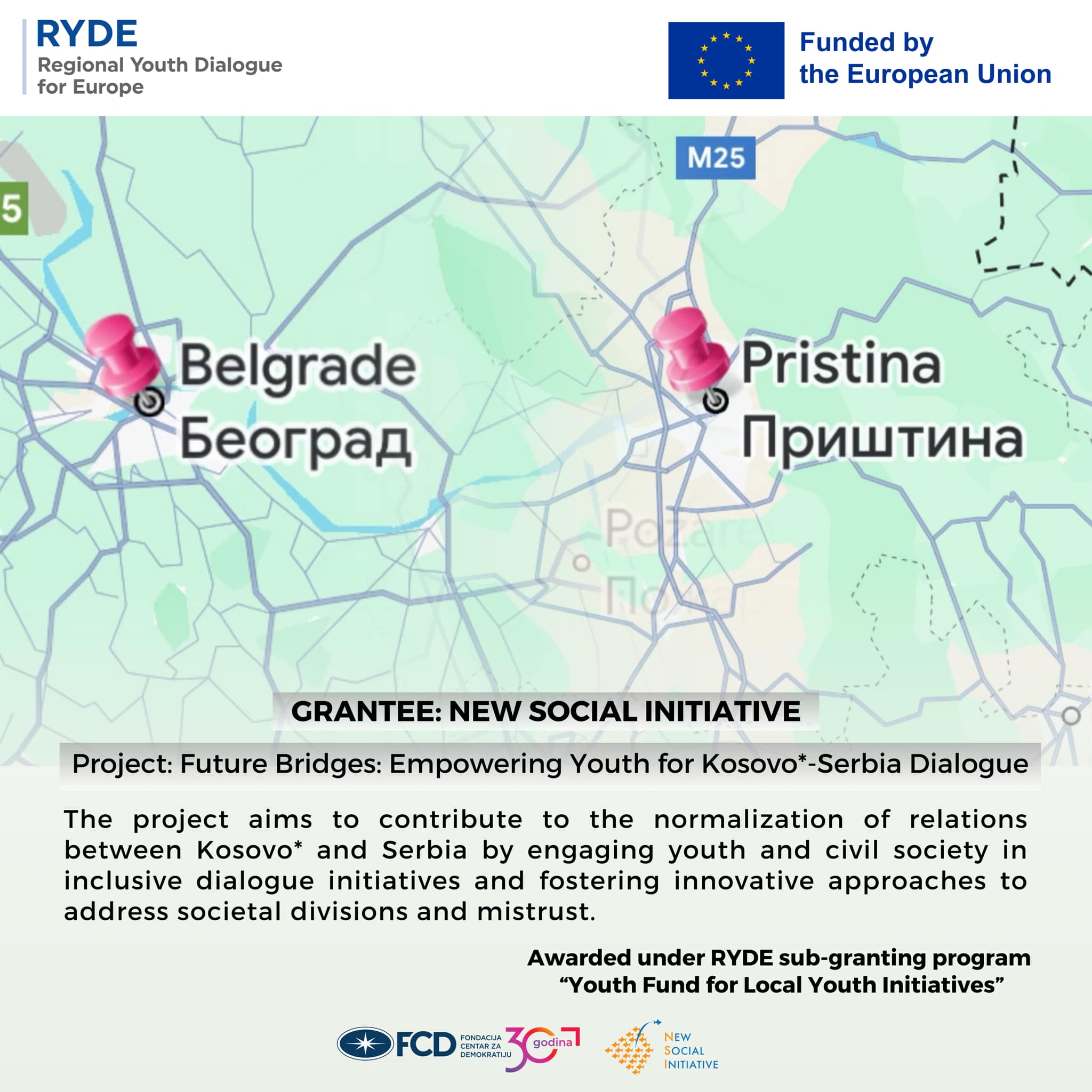 Naziv projekta: Future Bridges: Empowering Youth for Kosovo*-Serbia Dialogue (Mostovi budućnosti: Osnaživanje mladih za Dijalog Kosovo*-Srbija).